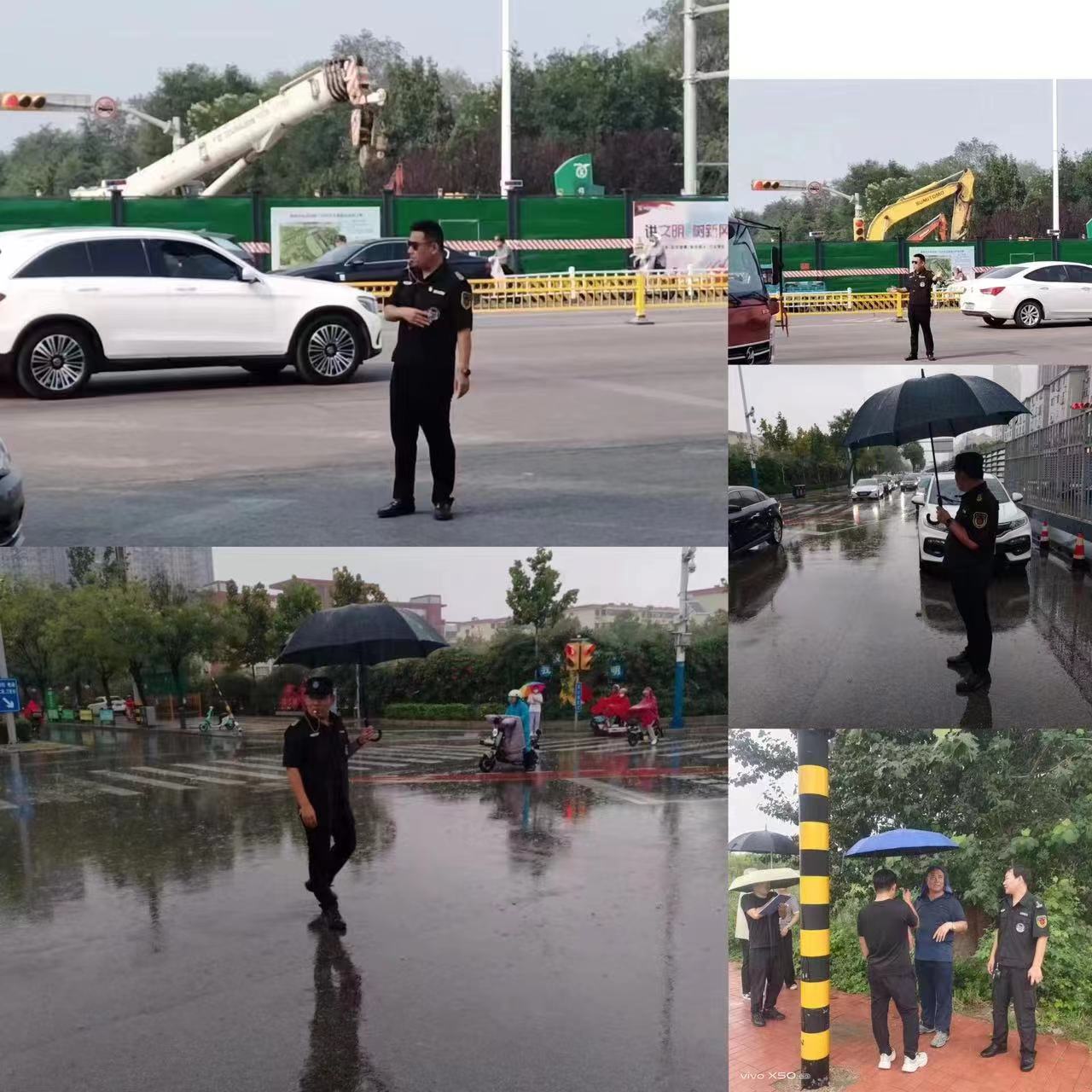 一公司承接多處道路交通協(xié)管勤務(wù)且點位較為分散,7月28日下午,副總經(jīng)理王洪林深入勤務(wù)現(xiàn)場,與交警部門積極對接,對執(zhí)勤點位安全隱患進行排查,并要求各分管隊長務(wù)必高度重視,對存在安全隱患的警示牌,迅速對接施工方對其進行加固,以免發(fā)生事故,同時叮囑隊員們在做好自身防護的前提下,嚴格落實好各項防汛舉措,確保道路安全暢通。由于城區(qū)突降大雨,加之正值下班高峰時段,車流量不斷加大,車輛通行緩慢,王洪林也加入交通疏導(dǎo)隊伍,與隊員們一起冒雨疏導(dǎo)過往車輛,緩解交通通行壓力。