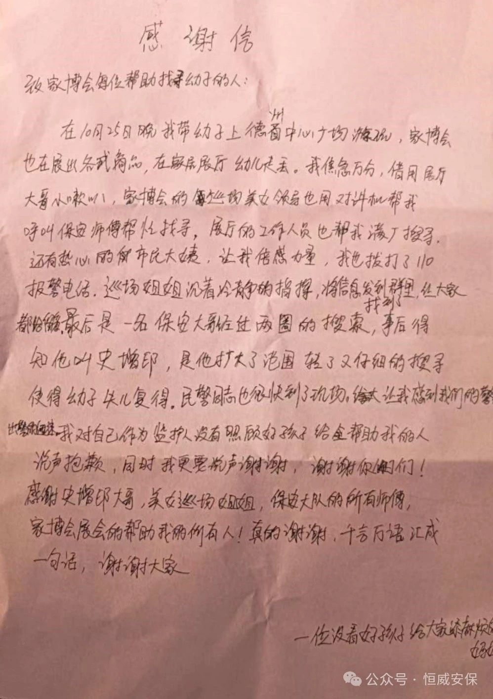 【凡人微光】萌娃貪玩走失家人萬分著急,恒威保安暖心助力獲贈錦旗
