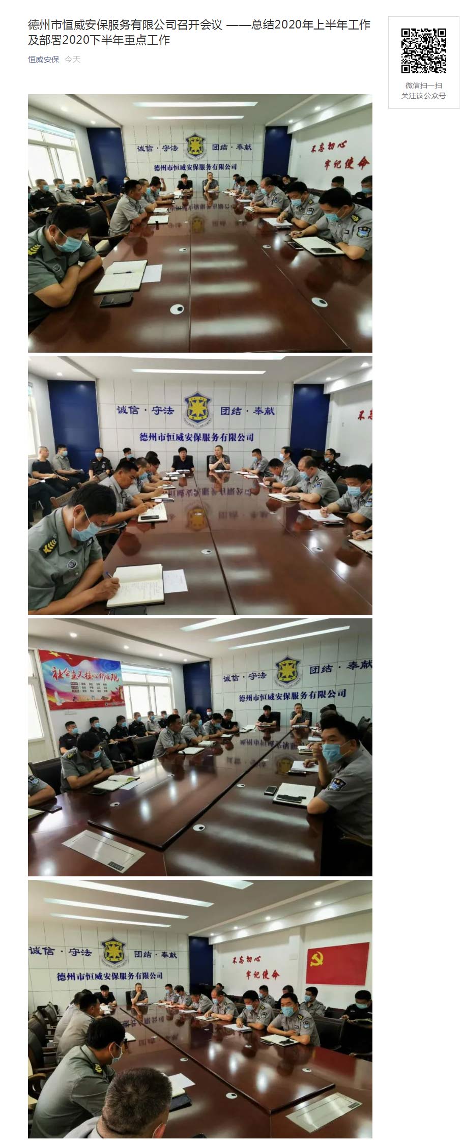 6月12日上午,德州市恒威安保服務有限公司王新衛總經理主持召開會議,總結2020年上半年工作及部署2020下半年重點工作。會議聽取了各職能部門及分公司負責人近期隊伍管理、人員增長、文明創城等工作匯報,公司中隊長以上管理人員參加會議。
